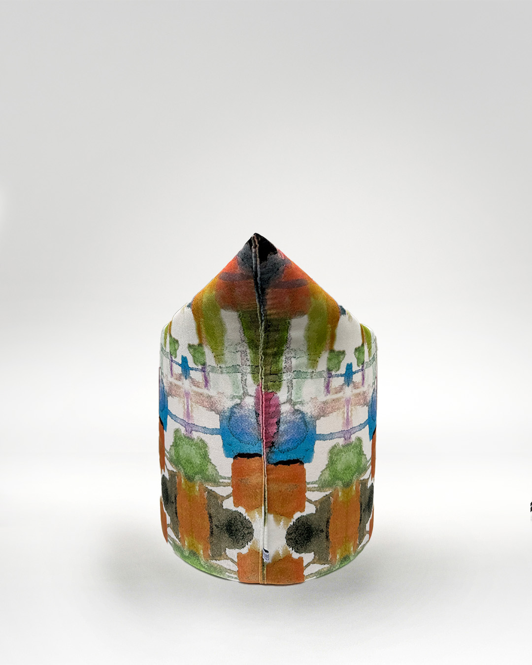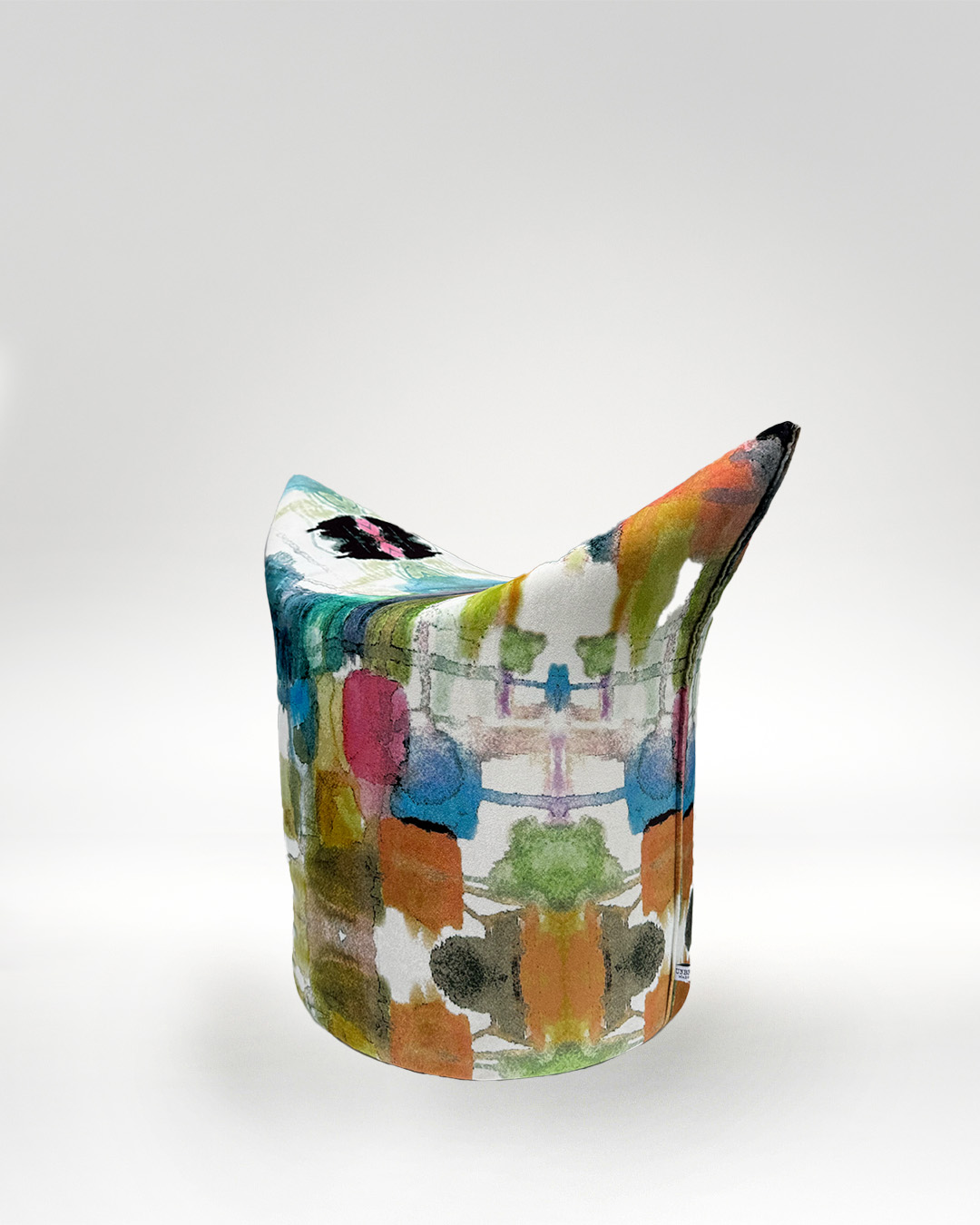 LOW STOOL WITH A PRINT – Seat depth: 42 cm – Seat: Layer of foam covered with Velour (100 % polyester). With useful handle. – Frame: Hard foam reinforced with wooden panel. – Made In Germany
